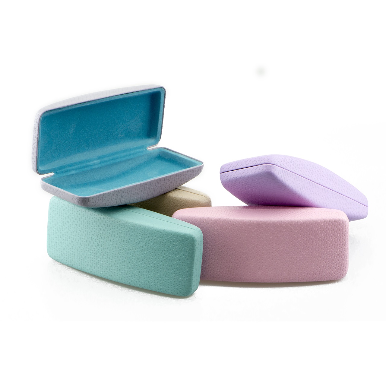 Tapered medium size faux lizard optical case in soft shades with pop linings.