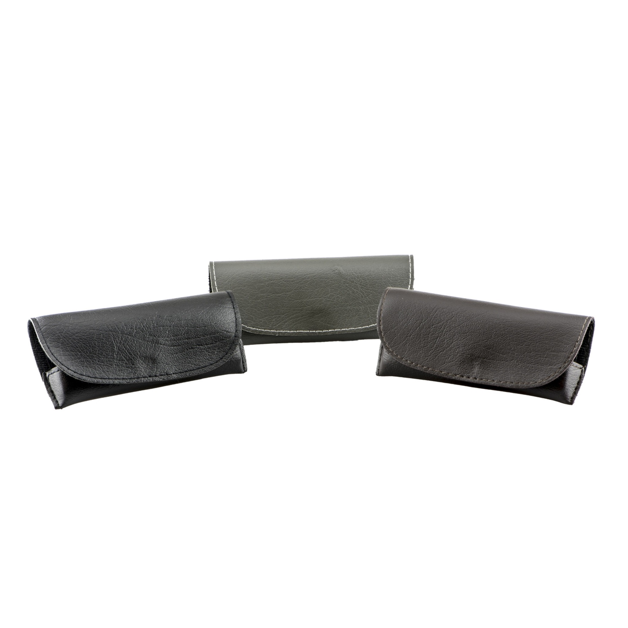 Heavily grained faux leather material on a foldover case with open sides and velcro closure.