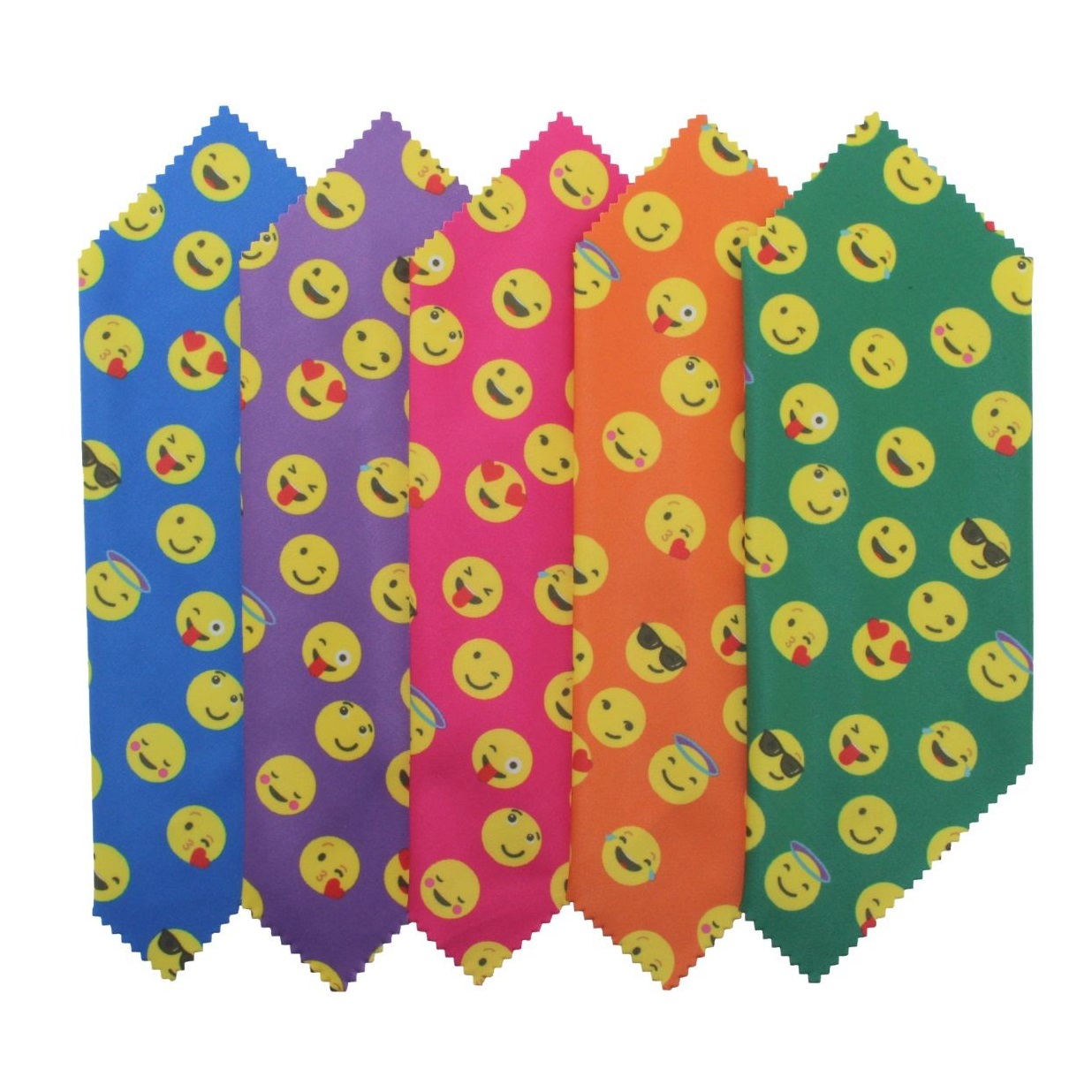 Microfiber cleaning cloths in emoji shape colors or assortment of blue, green, pink, purple and orange. Loose packed.