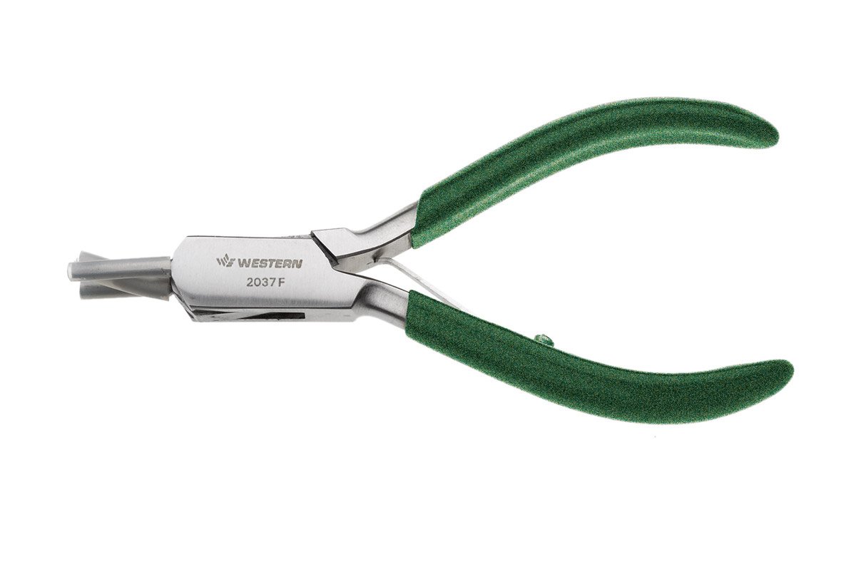 The Rx came back from the lab and the optical center is off 1mm to the outside in both eyes. You can bring in the optical center on both eyes by reducing the bridge width. You have a patient with a small bridge and over extending the nose pad arm is not cosmetically acceptable. Reduce the bridge so you can adjust the nose pads comfortably. The three jaws of this plier engage the bridge from above and below for moderate reduction. For both metal and plastic bridges.
